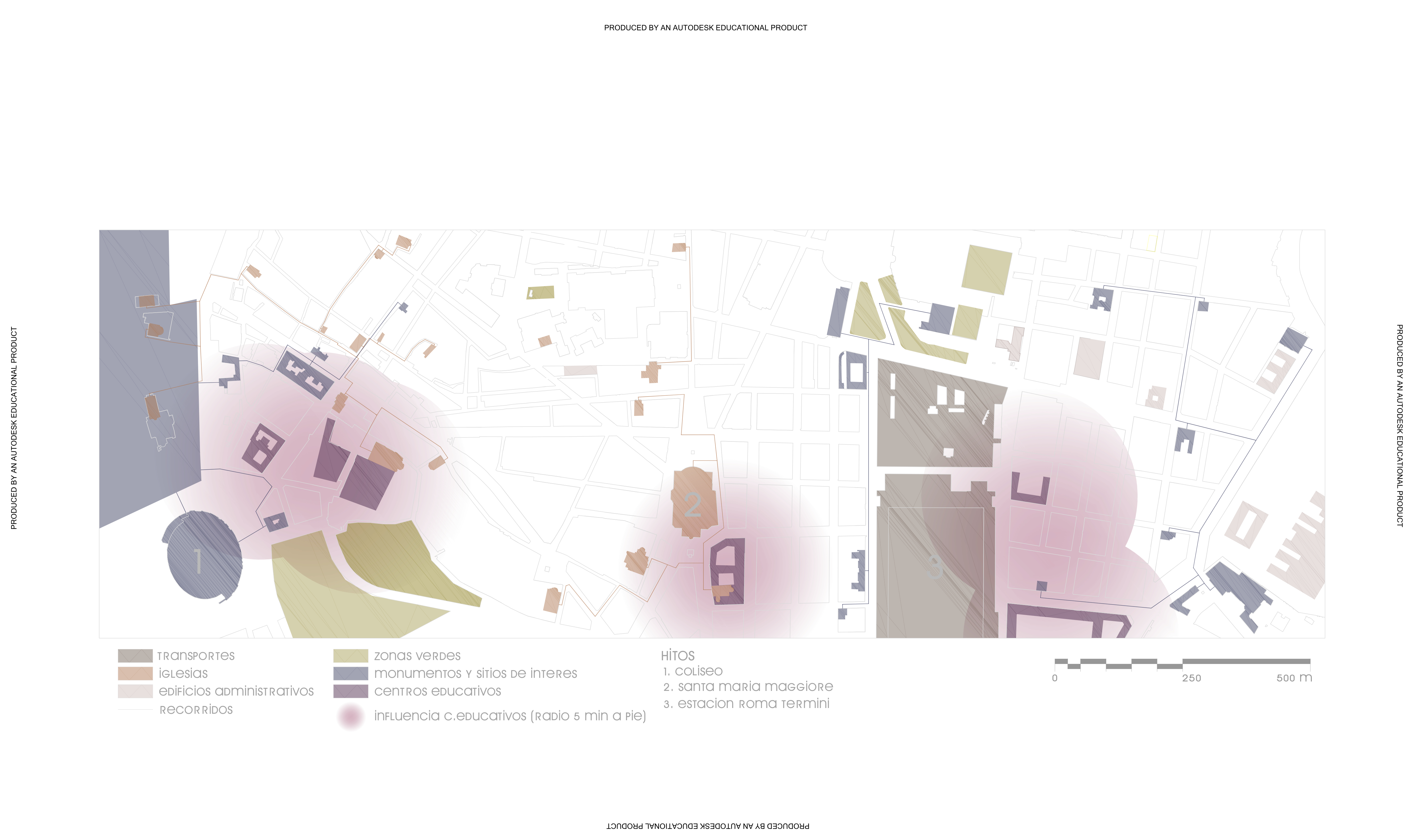 Plano de Usos de Roma: En este panel tenemos el plano con los usos que hemos considerado más significativos. Los mismo han sido relacionados entre sí y hemos querido señalar el radio de influencia que tienen (5 minutos a pie).