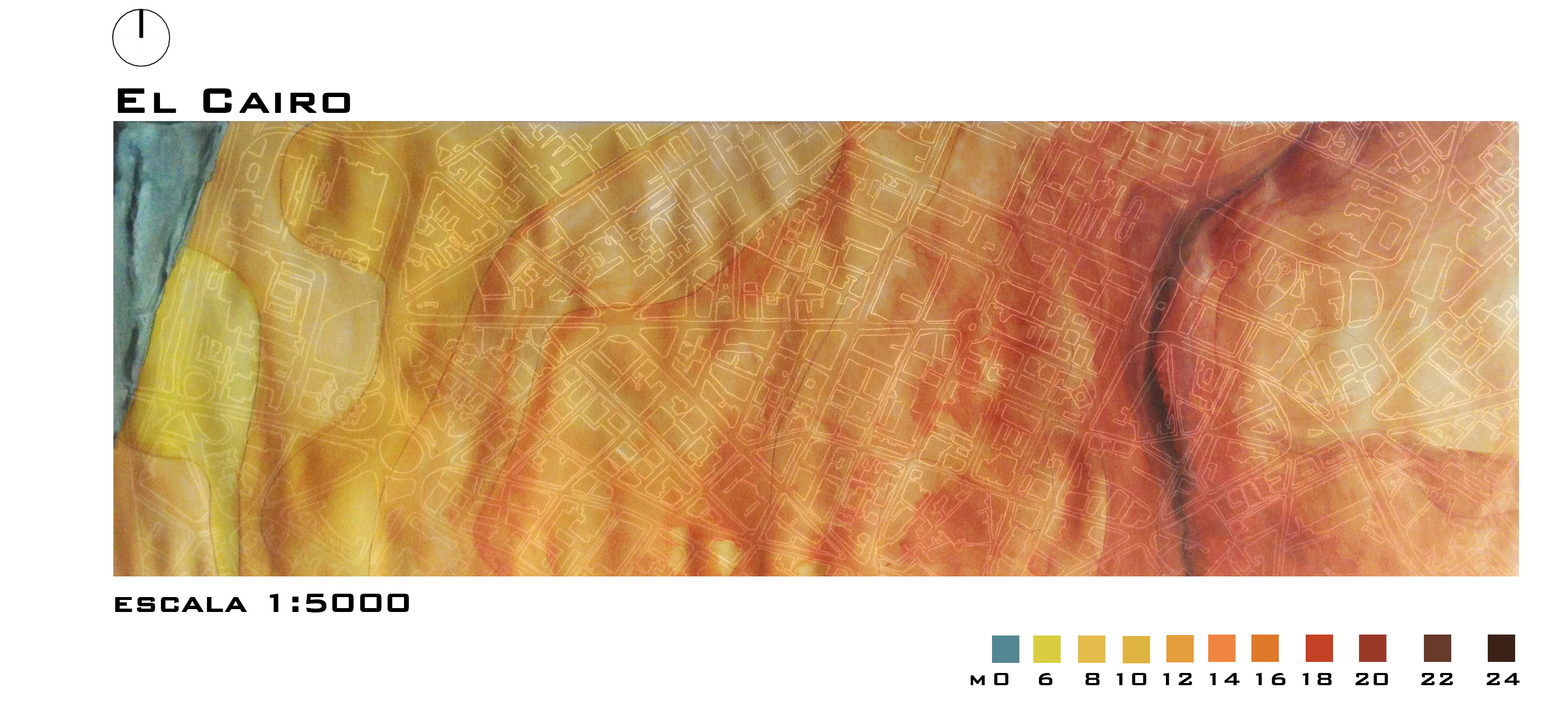Plano de El Cairo que muestra la topografia del lugar con las relativas curvas de nivel y cotas. Se puede ver como las partes del rio tienen altitudes mas bajas de la zona mas interior de la ciudad. La diferencia de cotas es minima: da la cota 0, (presunta del rio) a la cota mas alta que es, mas o meno, de 24 metros, con una differencia de una a la otra de pocos metros. Las carreteras que unen la parte baja de la ciudad con la mas interior siguen la topografia del lugar, con una pendencia creciente. Se pone tambien una seccion territorial que muestra en elevation este cambio de cotas,