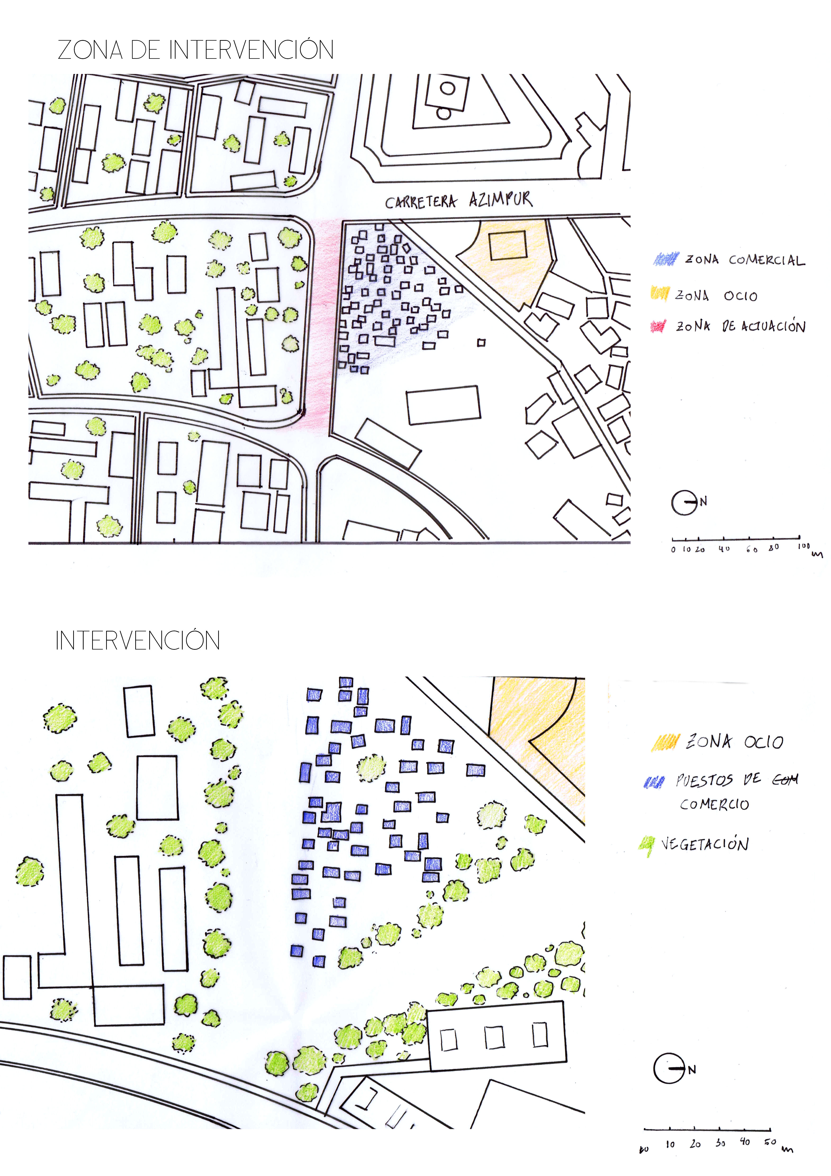 Esta intervención se desarrolla en un ámbito cercano a varios núcleos importantes de la ciudad, una zona comercial de gran extensión ubicada en un lugar de alta congestión y un edificio de ocio que alberga un cine. La propuesta plantea la supresión del viario junto al mercado, creando así un espacio de desasosiego con zonas verdes, que inciten a realizar la tarea comercial de una forma menos congestionada. La propuesta también plantea la unión de esta zona peatonal con el edificio de ocio. Quedando ambas zonas vinculadas.