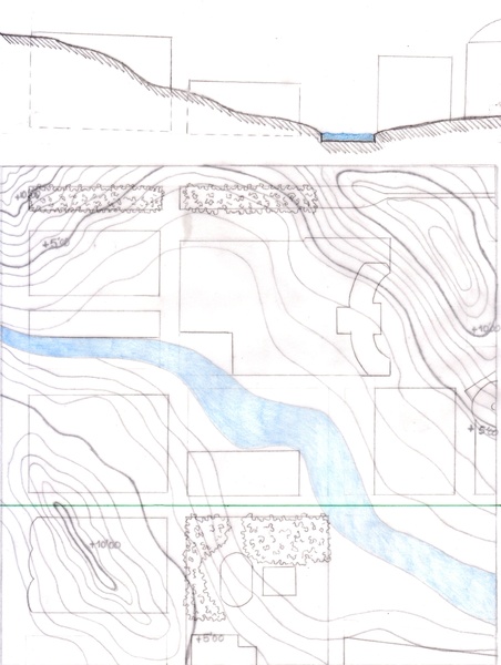 Trabajo de taller, que consistía en: crear una topografía imaginaria, dibujar la edificación de la zona correspondiente de la ciudad, superponer ambos elementos, hacer una adaptación, teniendo encuenta los niveles, río, etc; y por último realizar una sección por una calle.