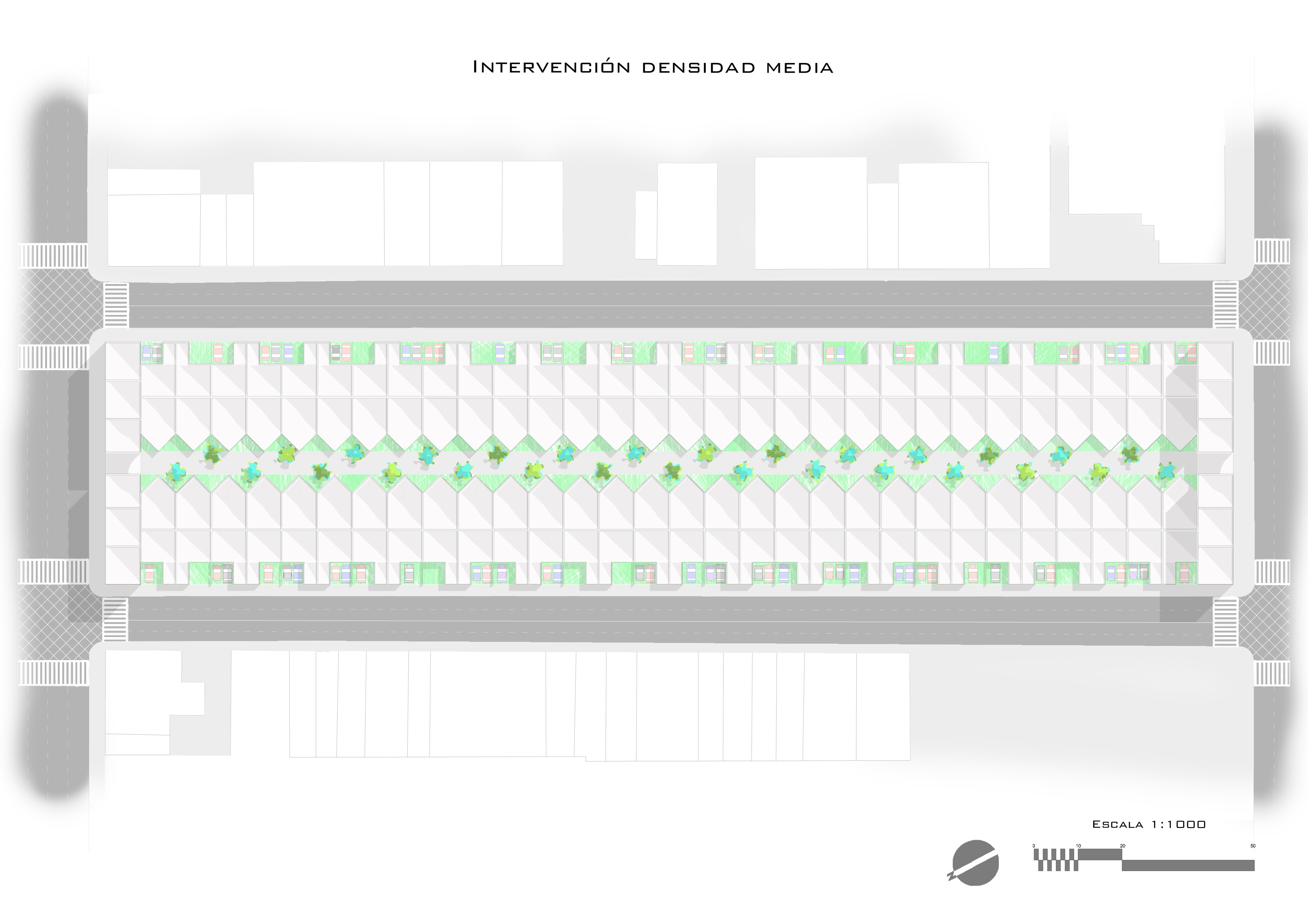 En este ámbito de la ciudad, conjunto de tres manzanas que componen este superblock, se pretende cubrir todos los usos básicos que pueda tener cualquier inquilino tanto del mismo "recinto" como del entorno.