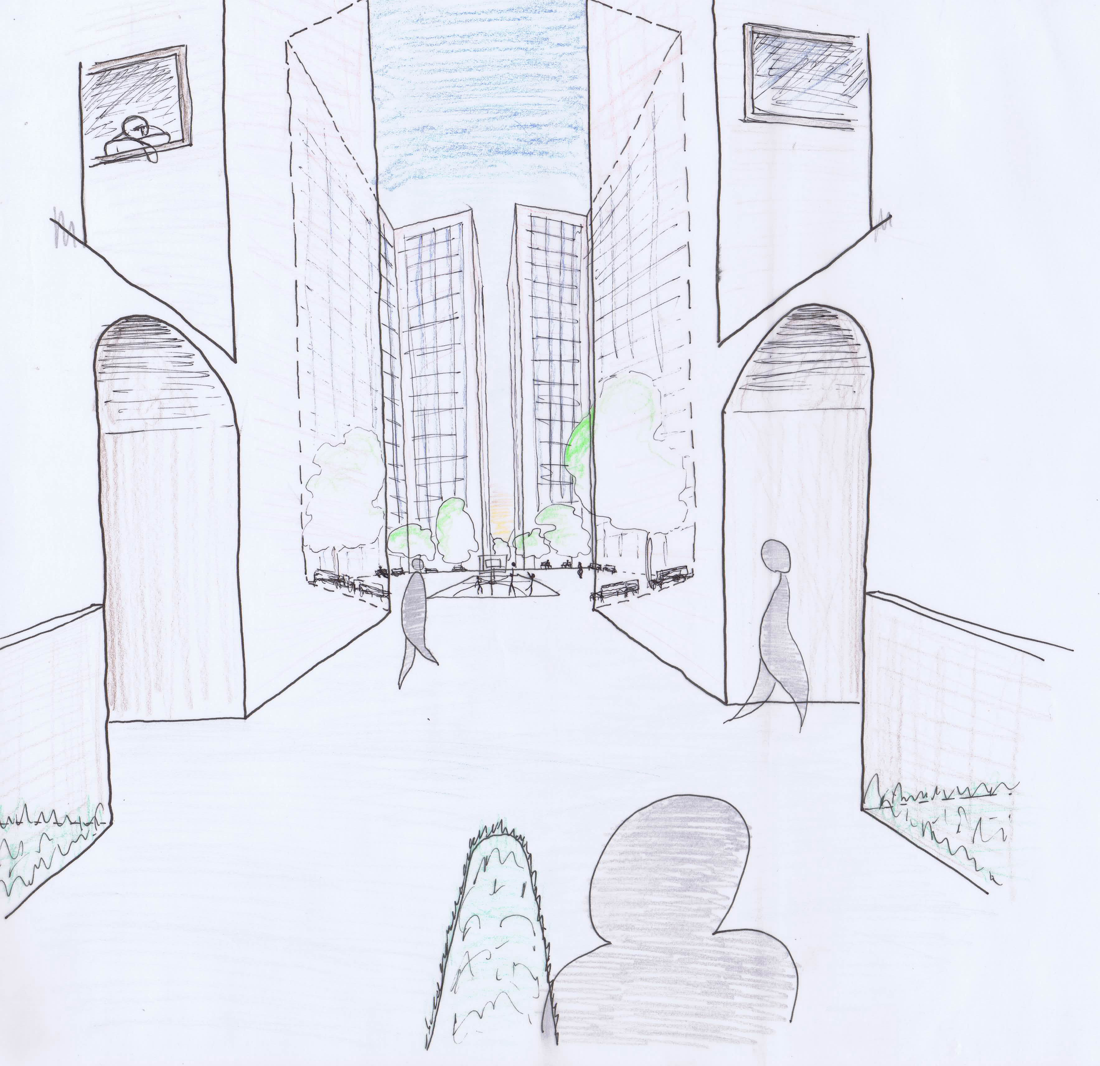 Croquis base. Espacio interior entre edificios en altura que conforman una plaza pública pero de nuevo con un alto carácter privado al mismo tiempo.