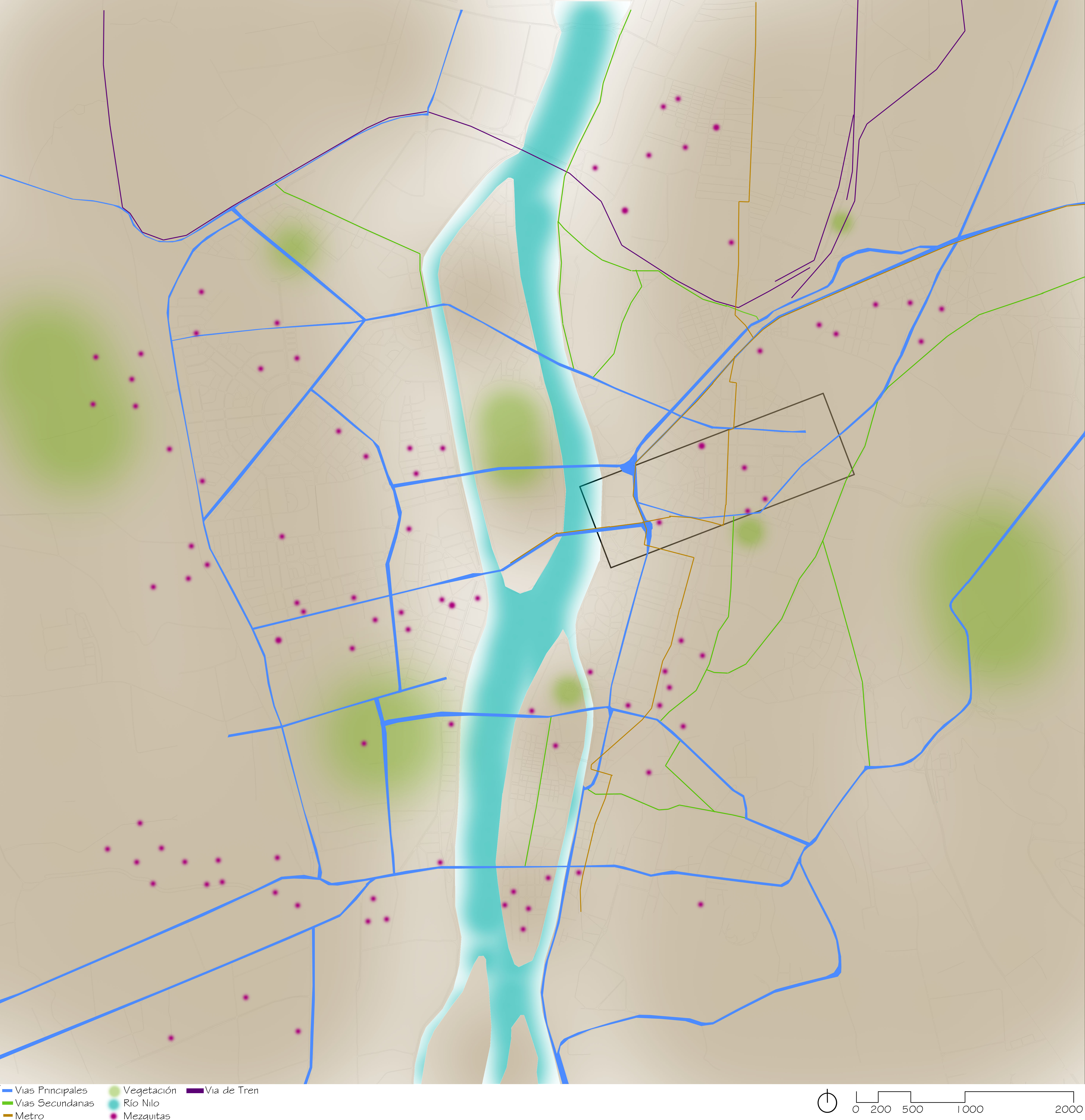 Corrección del primer ejercicio, donde a parte de las vías principales y secundarias, así como el tipo de transporte, que ya habíamos analizado, añadimos los principales edificios en la ciudad del Cairo.