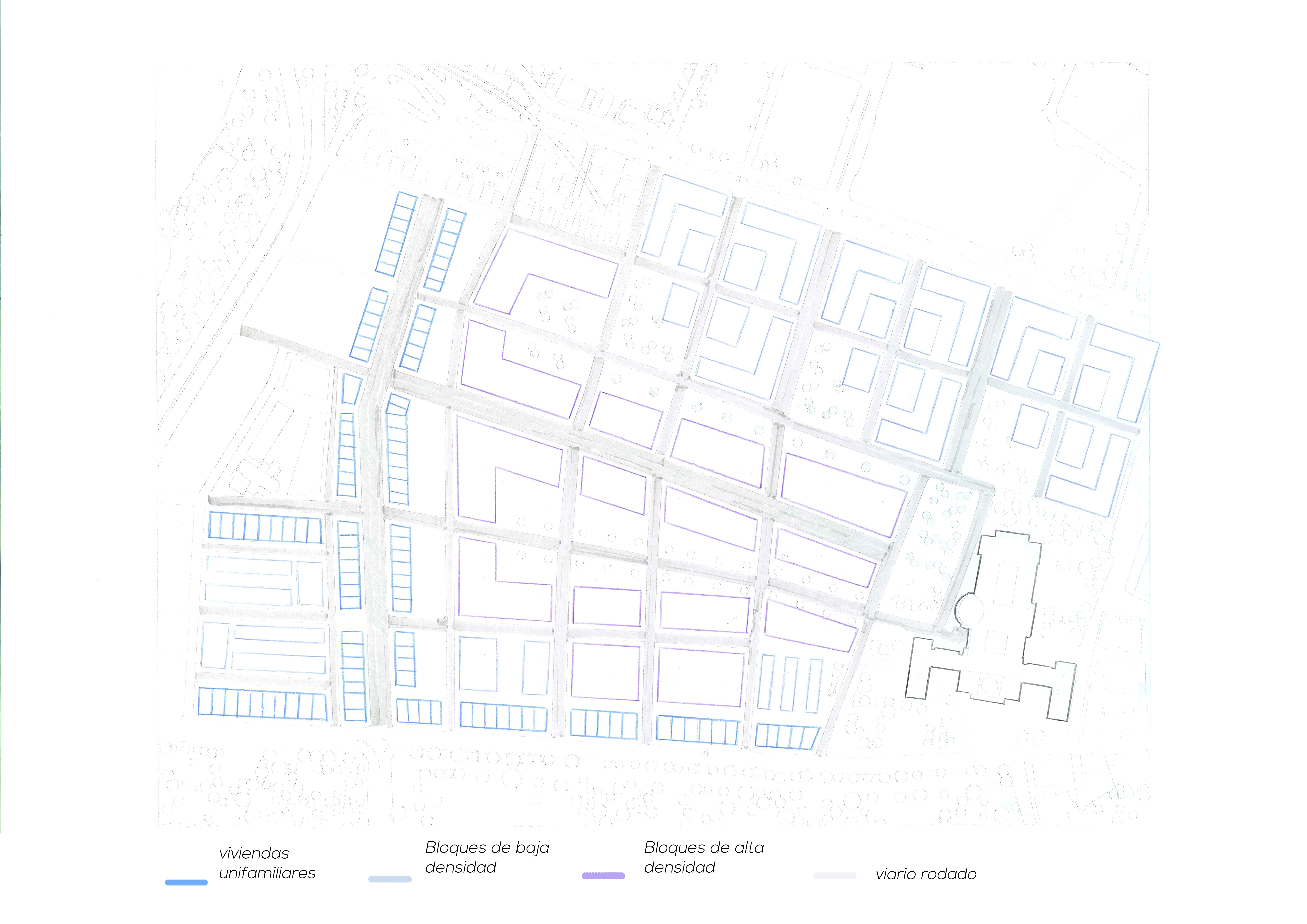 Hemos continuado calles que aparentemente se interrumpían sin sentido alguno, creando así manzanas que no se adaptaban a las viviendas preexistentes. Se introducen dos nuevas tipologías de viviendas, distinguiéndose bloques de alta densidad, bloques de baja densidad y viviendas unifamiliares.
