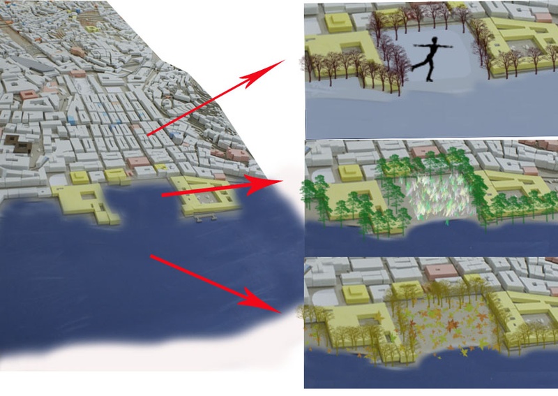 Se pretende crear una continuidad entre el río y la ciudad produciéndose distintas situaciones según las estaciones del año