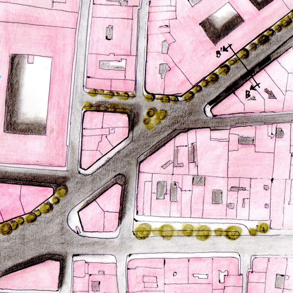 Análisis de formas de la ciudad y Propuesta de transformación de una calle. La entrega contiene una sección tipo de la zona de actuación. En este caso hemos hecho una sección quebrada aprovechando la confluencia de dos días principales. También contiene una actuación consistente en la construcción de un aparcamiento para motos y bicicletas en una zona donde estos vehículos quedan aparcados en la acera en la confluencia de las calles Réamur y Turbigo. El aparcamiento consiste en la habilitación del firme y la construcción de una pequeña estructura metálica de protección que permite que crezca vegetación en su parte superior.
