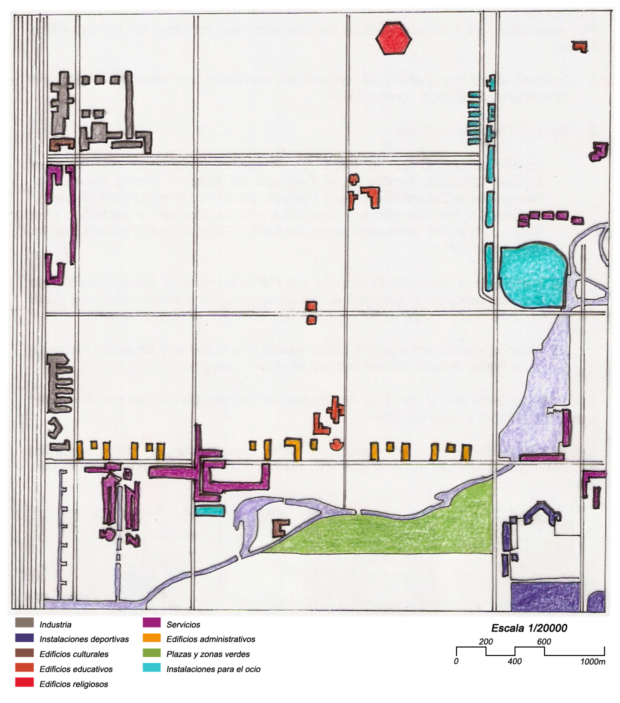 Por otro lado, si prestamos atención a la distribución de equipamientos en las ciudades, vemos que en Berlín, a pesar de mostrar en esta zona una especial concentración de edificios culturales/educativos, el resto funciones se encuentran más o menos repartidas "homogéneamente". En cambio, en Broadacre City, los distintos equipamientos se encuentran organizados por zonas dependiendo de la función de cada uno.
