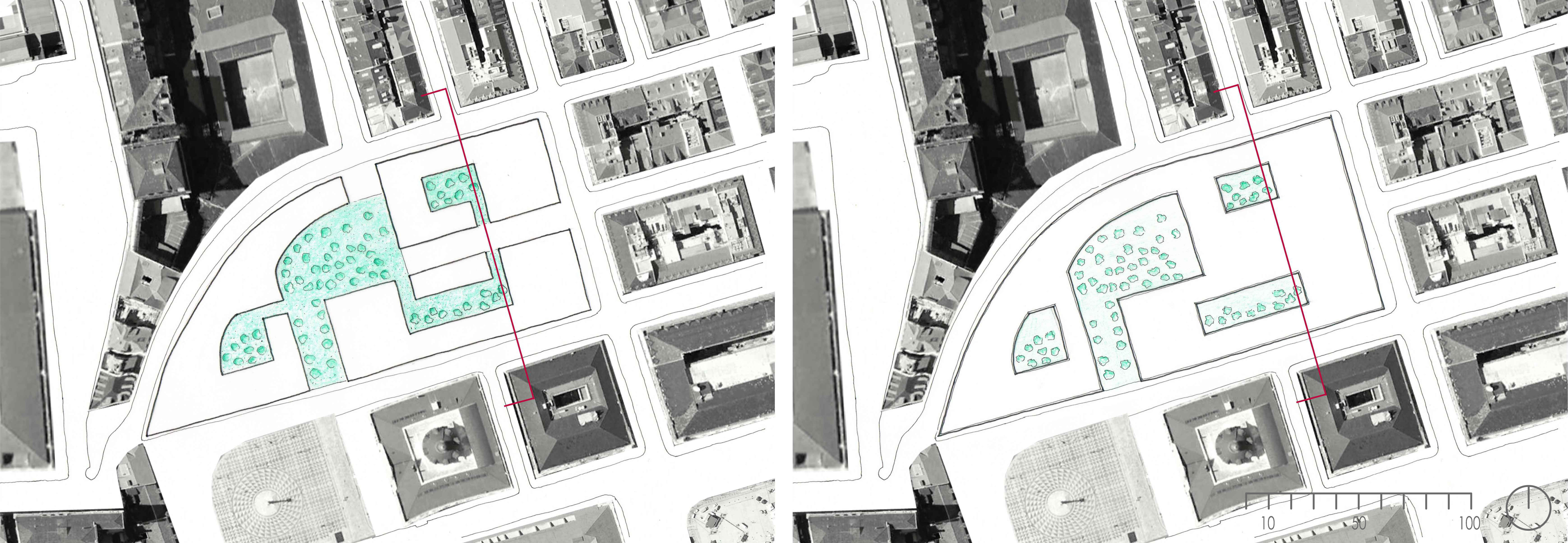La propuesta conjunta sobre las tres parcelas busca darles una formalización unitaria, formar parte de un proyecto común a modo de superblock. El elemento de conexión es una zona verde central que se introduce en los edificios creando una serie de patios. La zona verde está vinculada a la plaza del Municipio. Existe una visual entre ellas y puede ser una alternativa para pasear o descansar sin el ruido del tráfico y con lugares en sombra gracias a la vegetación.