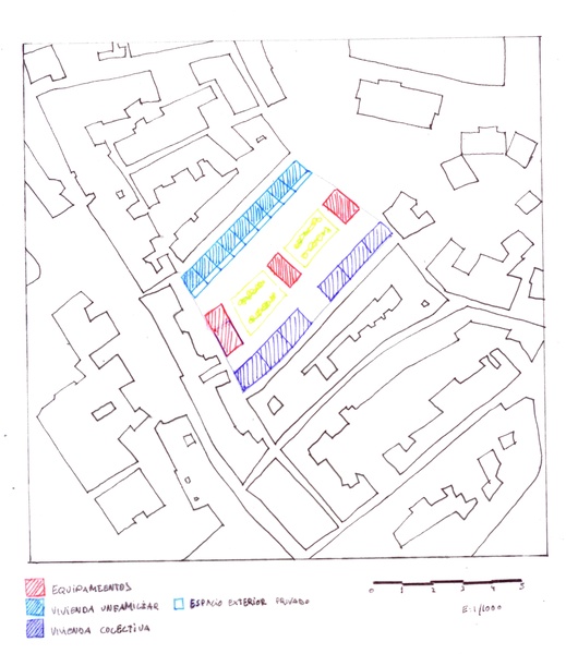 Sin la escala gráfica me es imposible evaluar este trabajo. En densidad baja recomiendo cualificar el espacio exterior, ¿ es público o privado? En el residencial densidad alta, ¿cómo se accede a las viviendas del interior de la manzana? Resolver. Vigilar asimismo viviendas que no tiene espacio exterior al fondo ya que no se puede resolver satisfactoriamente su iluminación y ventilación. En el 4/4 se propone edificaciones colectivas que probablemente estén demasiado cerca de otras edificaciones (necesaria la escala gráfica)